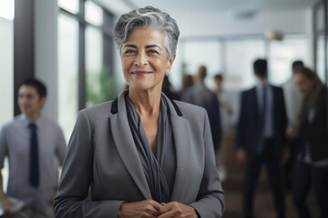 A portrait of a Hispanic businesswoman smiling and looking directly at the camera as he stands in an office while people stand out of focus in the background.