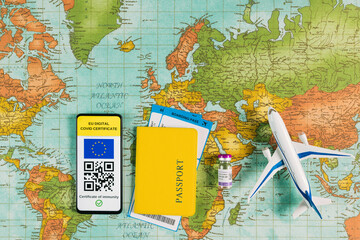 Valid digital COVID certificate on mobile device for verification. Green pass certificate for coronavirus vaccinations. Passport app in mobile phone. Coronavirus QR code scanning application.
