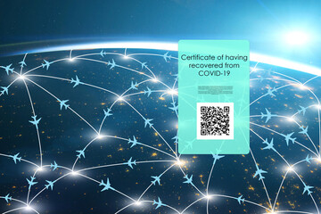 green digital passport,certificat of having recovered from covid-19 with planes and copy space,Element of image provided by NASA