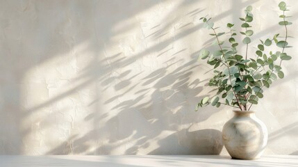 Green eucalyptus branches in vase by bright wall