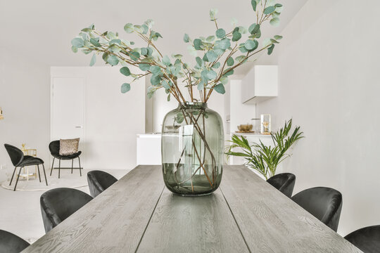Statuette and vase with eucalyptus branches on chest of drawers near green wall in room, closeup