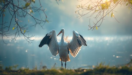 White stork with wings spread and grooming at a Maharashtra bird sanctuary, highlighting avian activity and environment