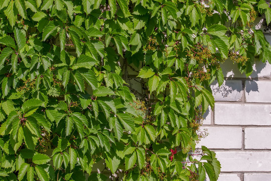 Thickets of wild grapes on a white brick wall. Natural background of green leaves. Summer sunny day.