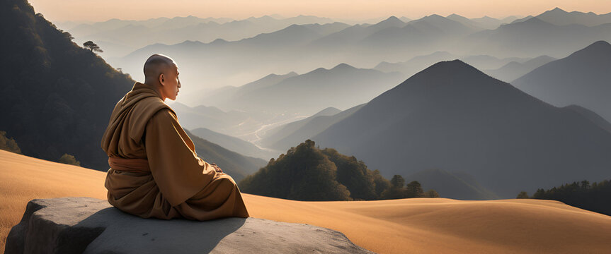 monk sits and looks at the mountains