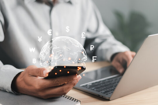 Person holding smartphone with glowing digital globe of currency symbols and data streams finance