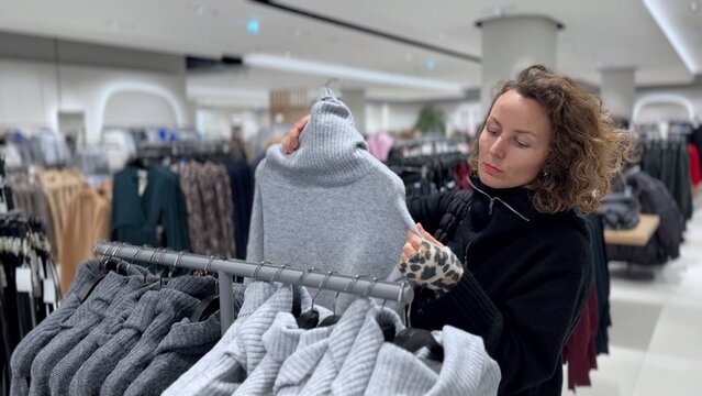 Woman browsing winter clothing, closely inspecting grey turtleneck sweater on boutique rack, evaluating knit fabric quality and style for seasonal wardrobe update. Clothing store for every day