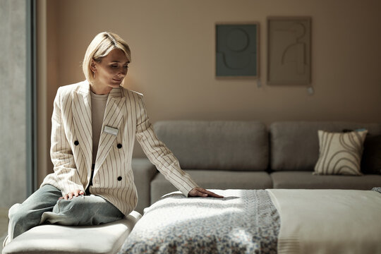 Caucasian young adult woman sitting on ottoman touching bedspread in furniture store, evaluating fabric texture with thoughtful expression modern sofa and wall art in background