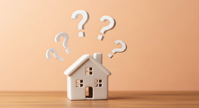 Miniature house surrounded by question marks representing housing decision real estate uncertainty investment confusion and market evaluation