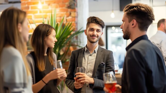 A group of young professionals engaging in conversation and networking at a social event, holding drinks in a modern venue..