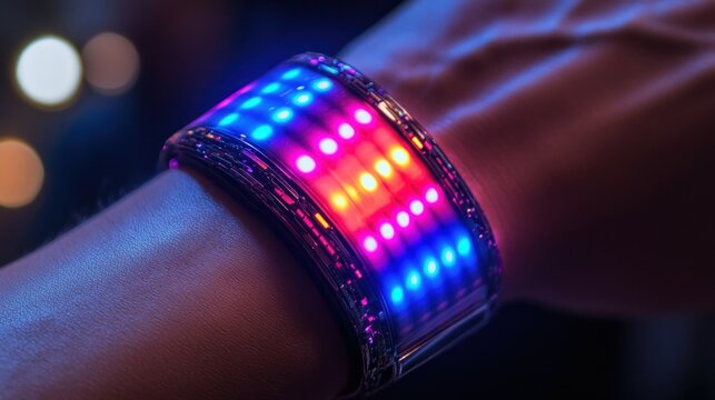 Close-up of a bio-metallic wrist accessory with colorful glowing holographic emitters at a night event
