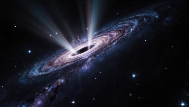 Cosmic illustration of a black hole devouring matter, encircled by swirling galaxy
