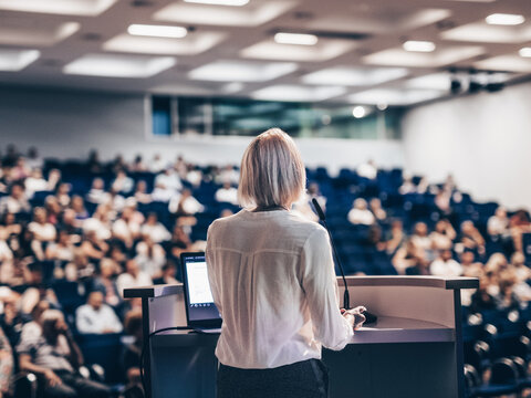 Female speaker giving a talk on corporate business conference. Unrecognizable people in audience at conference hall. Business and Entrepreneurship event