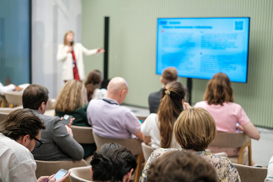 Close up Portrait of young Businesswoman attending a leadership business conference, listening to Motivational inspiring confident speakers and gaining insights into effective practices Event.