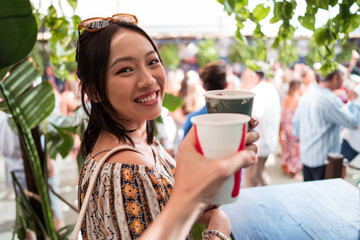 Happy Asian woman proposing toast to friend