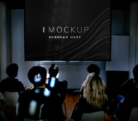 Young man watching movie in theater with diverse audience