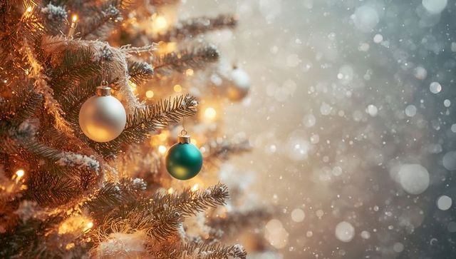 Photo of closeup of a decorated christmas tree with ornaments and golden tinsel, with bokeh lights in the background