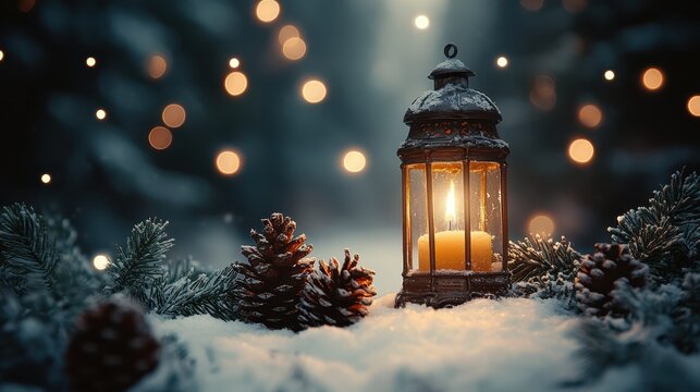 A glowing lantern surrounded by pinecones and sprigs of evergreen in the snow.