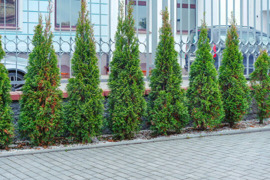 Row of evergreen thuja trees growing as green hedge fence along walking pathway at countryside cottage backyard. Landscaping design with topiary concept.