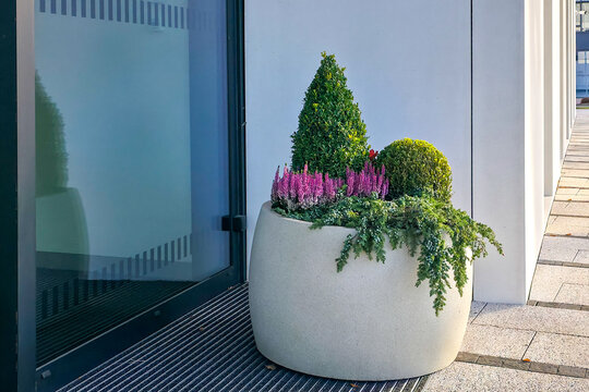 A vibrant, colorful garden arrangement with various flowering plants and evergreen shrubs