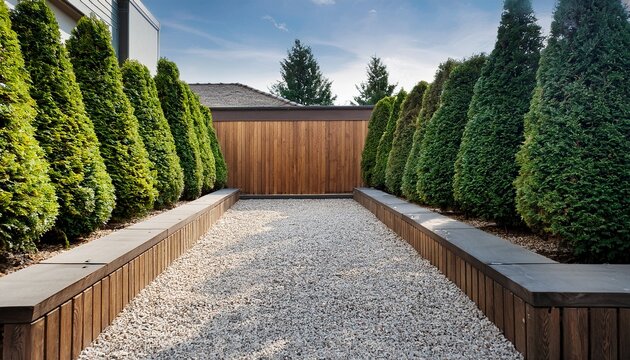 contemporary front yard with symmetrical evergreen hedges structured gravel zones and wood accents
