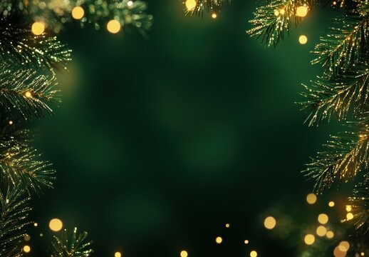 A serene and sparkling green background adorned with frosted evergreen branches and soft golden lights, perfect for festive holiday designs or seasonal greetings.