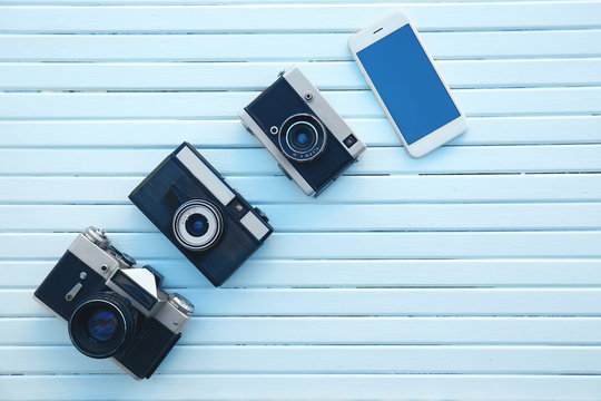 Camera evolution concept. Vintage and modern cameras on white wooden background
