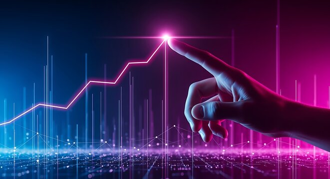Illuminated numbers float amidst a vibrant light display against a blurred city backdrop