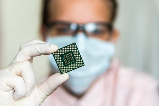 Scientist repairs electronic circuit and holding damaged electri