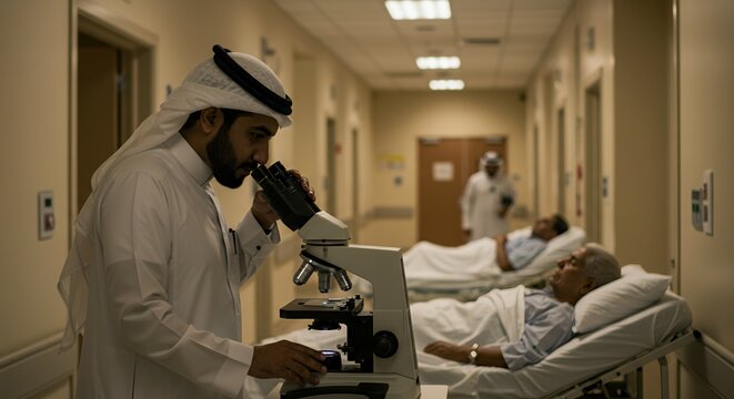 A doctor in traditional Middle Eastern attire meticulously examines a sample under a microscope in a hospital corridor, patients resting nearby.