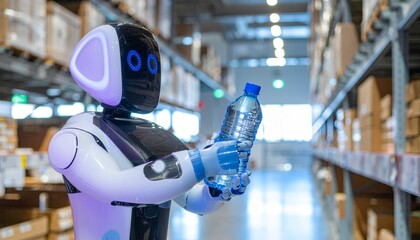 Warehouse Robot Examining Water Bottle: A futuristic robot carefully examines a clear plastic water bottle in a modern warehouse setting.