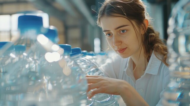 Closeup hand wear blue glove holds green mug to pour water into bottle to do science experiment. Concept, water quantity measurement for mixing chemical substances.