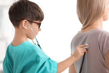 Child patient visiting at hospital. Doctor checking a boy heart with a stethoscope.