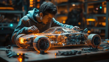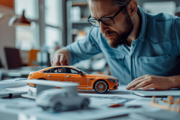 Executive analyzing car prototype in modern office environment
