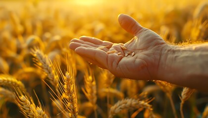 Farmer examining wheat crop in field, closeup of hands.