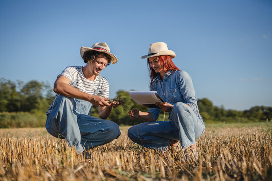 woman and man farmers in the field check quality of the soil