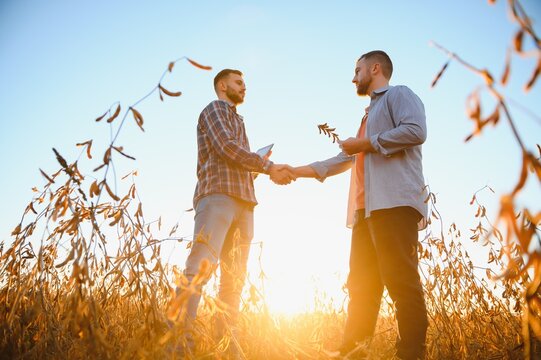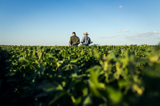 Agronomist inspecting soya bean crops growing in the farm field. Agriculture production concept. Agribusiness concept. agricultural engineer standing in a soy field