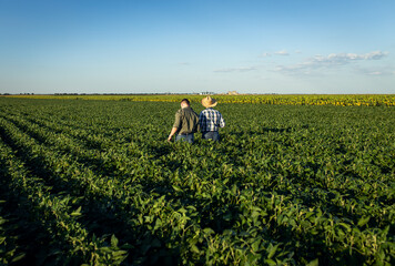 Rear view of two farmers in a field examining soy crop.