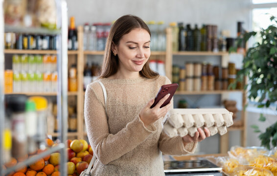 Positive young woman choosing healthy eggsand scanning barcode with smartphone to get information about product in small supermarket
