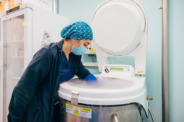 Embriologist putting sperm sample to examine under microscope or collecting in vitro cultured embryos for biopsy. Reproductive medicine clinic. Artificial insemination. Artificial conception clinic.