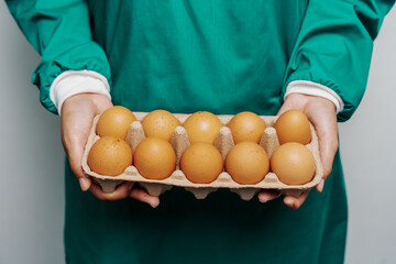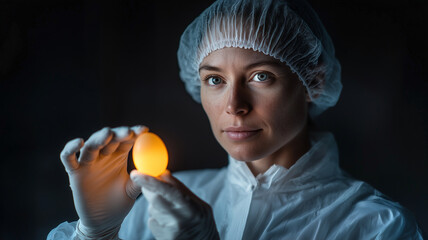 Healthcare professional medical worker examining organic chicken egg quality assessment, scientific for quality checking.