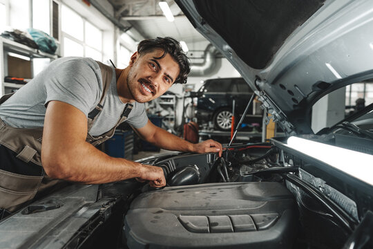 A young elegant man is looking under car hood at garage and preparing for a long trip.