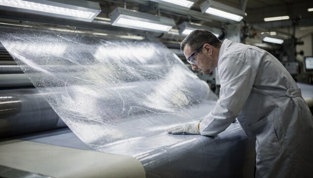 Medium shot of a technician manually inspecting fabric for coating defects closely examining pinholes and streaks under bright inspection lights in a controlled environment.
