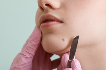 Surgeon with scalpel and mole on woman's chin against green background, closeup