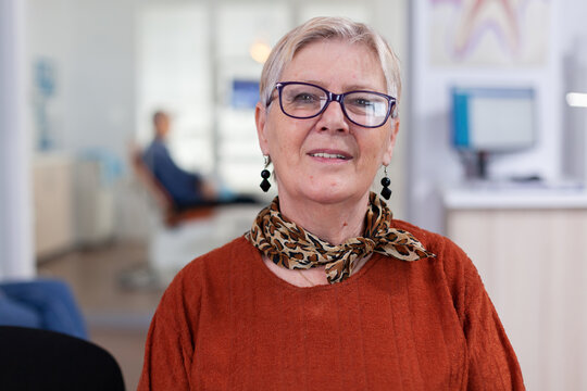 Elderly woman looking at camera while doctor examining patient in background. Senior lady smiling on camera sitting on chair in waiting room of stomatological clinic,