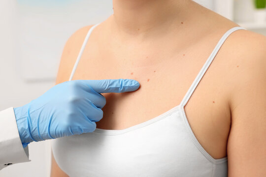 dermatologist examines birthmarks on the patient's skin with a dermatoscope. Dermatology, skin mole examining. looking for signs of melonoma or skin cancer.