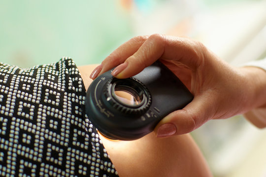Preventive checkup, skin melanoma days concept. Close up of hands of female doctor dermatologist oncologist holding new generation dermatoscope, examining birthmarks and moles of young afro woman