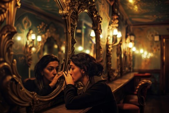 A sad depression woman in a luxury vintage style interior, surrounded by ornate mirrors, examining themselves