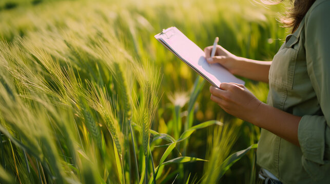 A person taking notes on a clipboard while examining a field of green crops during a sunny day.