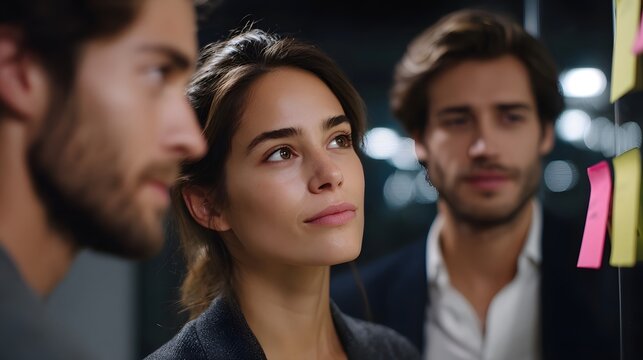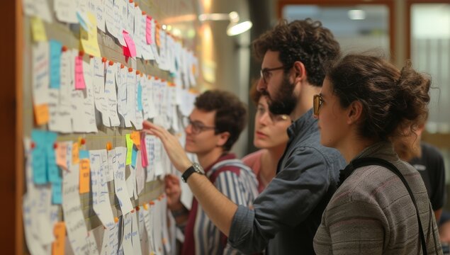 Colleagues brainstorm ideas on sticky notes on a glass wall in a modern office