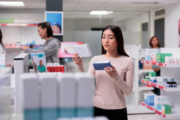Close-up of pharmacist examining blister pack of pills in a pharmacy. Medication, healthcare, and pharmaceutical industry.